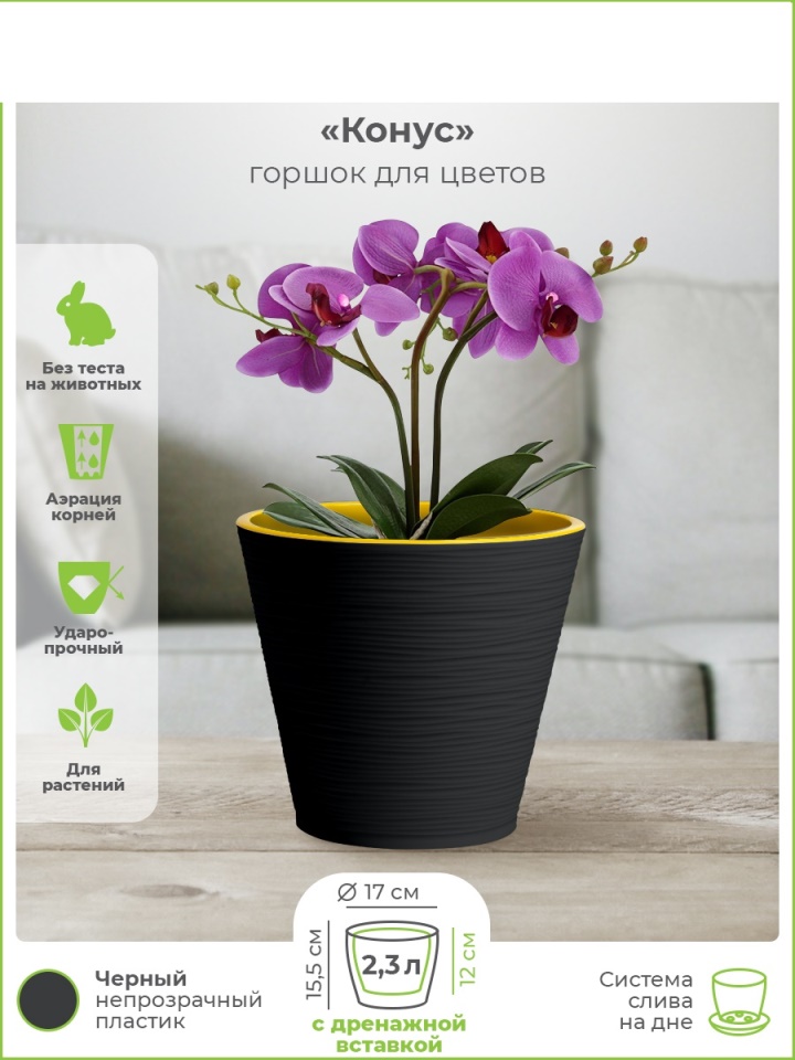 Кашпо КОНУС ЧЕРНЫЙ с вкладкой д.17 2,3л (12шт) К17-75 |